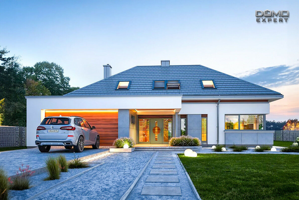 Budynek mieszkalny o nowoczesnej bryle: wielospadowy dach , dwukondygnacyjny-parter z poddaszem mieszkalnym. Pokój dzienny z kuchnią ,jadalnia z wyjściem na taras,2 sypialnie, garderoba, łazienka i osobne wc, oraz wiatrołap, spiżarnię, garaż dwustanowiskowy.